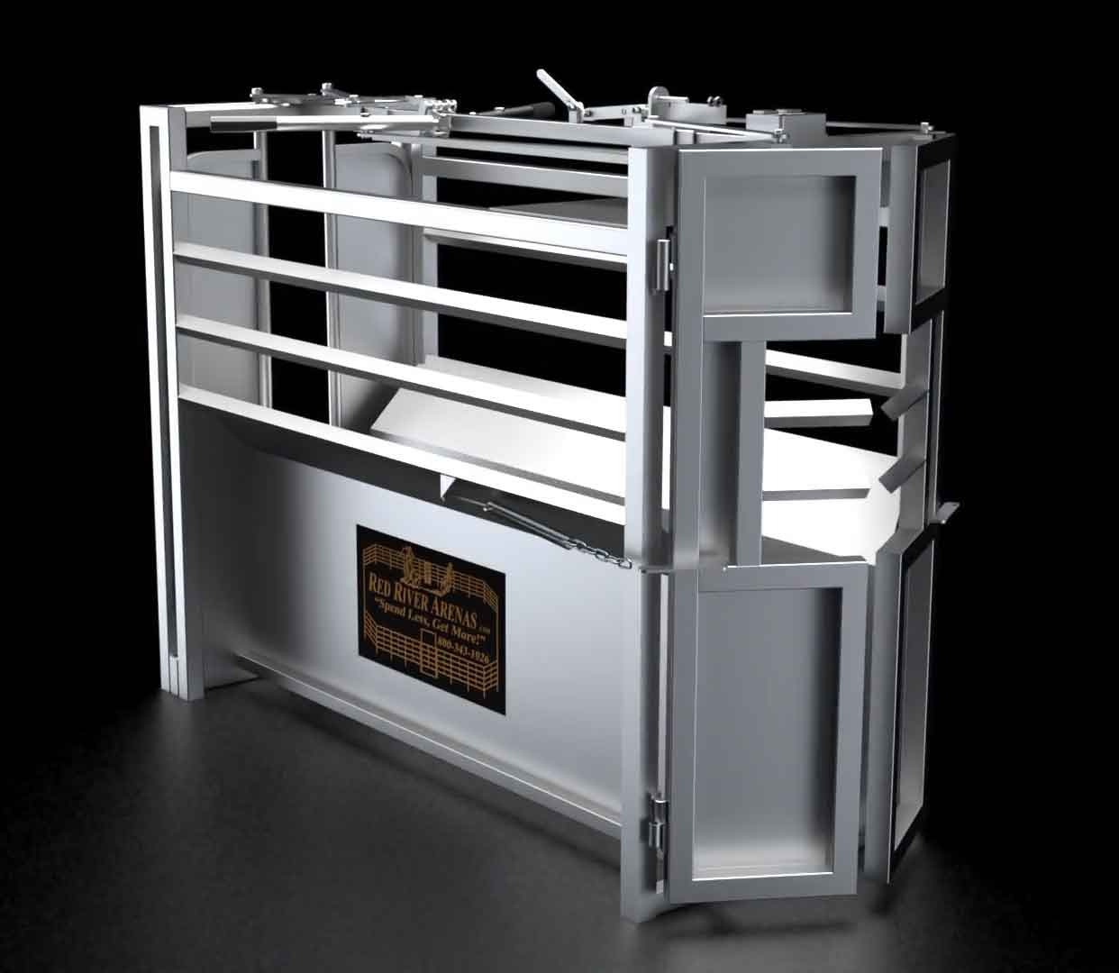 Red River Arena's roping chute is constructed from 14 gauge 2" galvanized square tubing and 14 gauge galvanized sheet metal. The combo steer and calf roping chute measures 6'4" long, 5' tall, and 32" wide OD and 28" wide ID and weighs approximately 545 pounds.