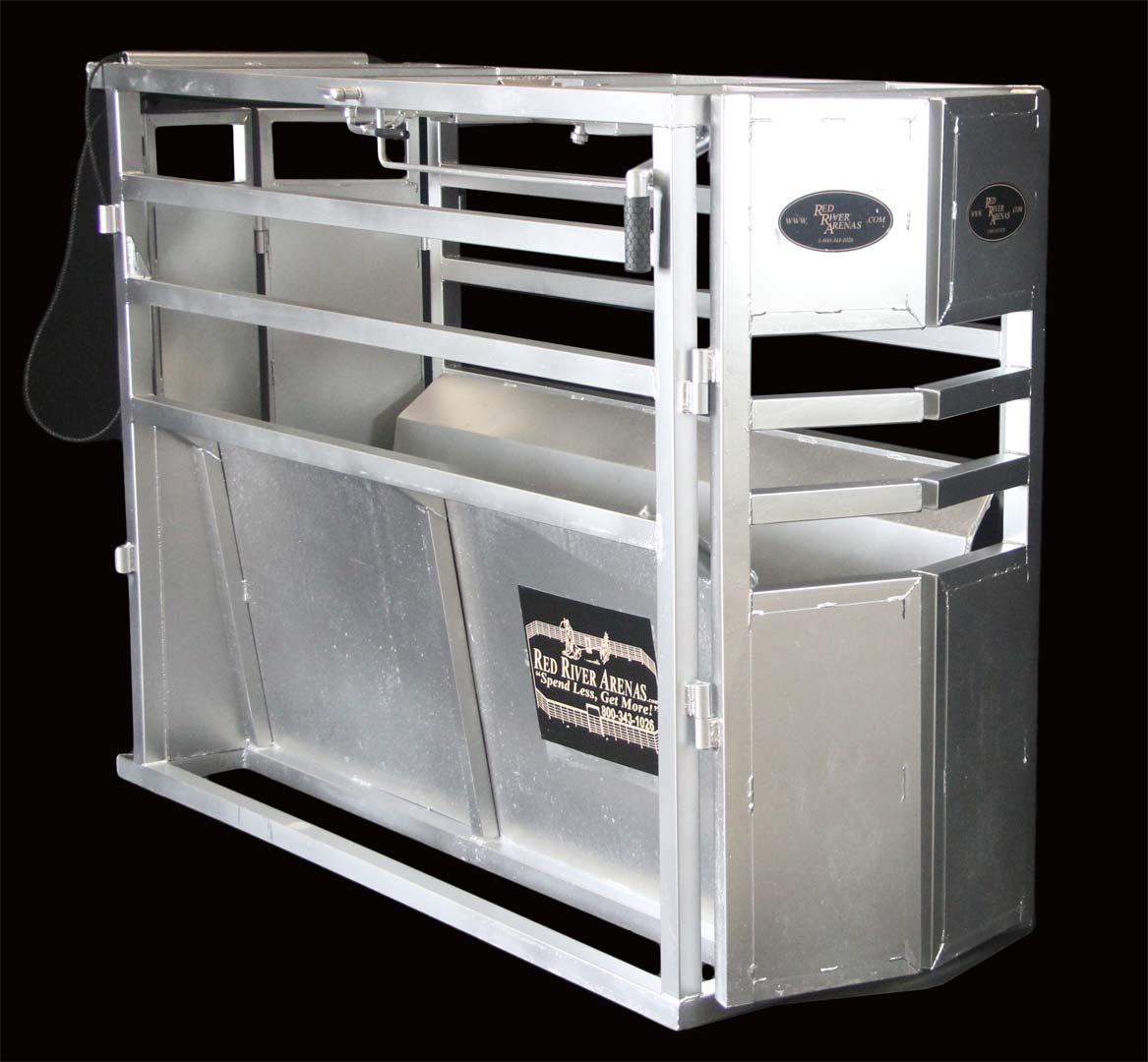 Red River Arena's roping chute is constructed from 14 gauge 2" galvanized square tubing and 14 gauge galvanized sheet metal. The combo steer and calf roping chute measures 6'4" long, 5' tall, and 32" wide OD and 28" wide ID and weighs approximately 545 pounds.