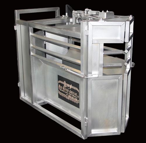 Red River Arena's roping chute is constructed from 14 gauge 2" galvanized square tubing and 14 gauge galvanized sheet metal. The combo steer and calf roping chute measures 6'4" long, 5' tall, and 32" wide OD and 28" wide ID and weighs approximately 545 pounds.