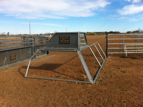 Red River Arena's all galvanized calf roping chutes are designed to let the calf roper have a smooth, easy practice. Red River Arena's calf roping chute is constructed from 14 gauge 1" galvanized square tubing and 14 gauge galvanized sheet metal. The calf roping chute measures 4' long, 4' tall, and 14" wide and weighs approximately 300 pounds. The front gates on the calf roping chutes are spring loaded to ensure a quick start and currently release quicker than any other calf chute on the market. Calf chute roping chutes are designed for one person operations and give the operator the ability to operate the front and rear gates from one position. The tail gate on the calf chute is a scissor style tail gate which is easy to open and close and prevents calves from sneaking into the chute during the run. This all galvanized calf roping chute will accommodate calves up to 350 pounds. Red River's calf chute keeps calves up front and will let you get the start you want, like a rodeo run. You can also add a 12 volt remote release, 12' extensions and L Sections to aid in a faster, more efficient practice..