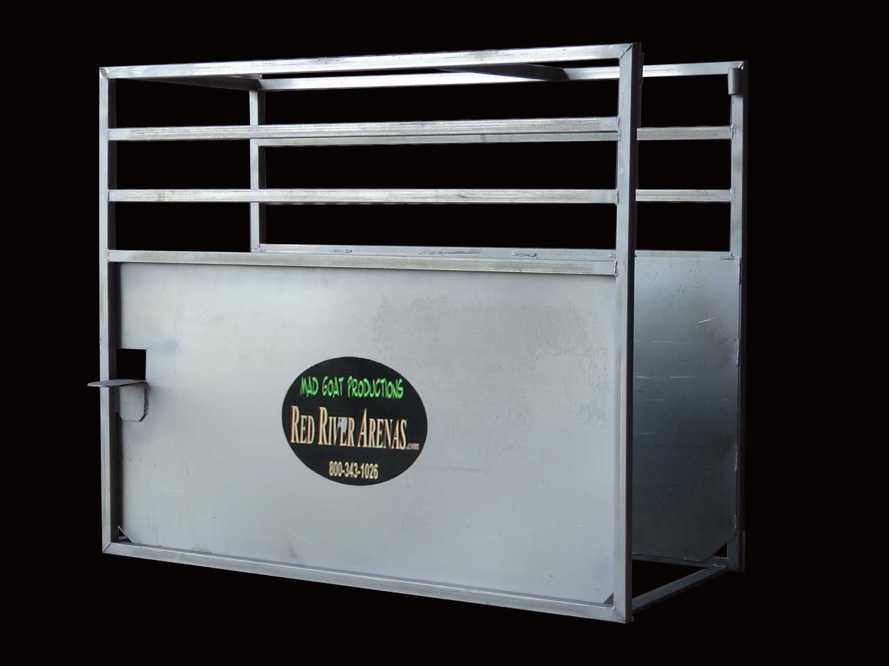 Red River Arenas is your source for Goat Roping Equipment! Red River Arenas and Mad Goat Productions have teamed up together to bring you a high quality and simple goat roping chute! Our goat roping equipment is constructed from 16 gauge galvanized square tubing and sheet metal. The goat roping chute features a simple kick release so you can focus on your run without needing someone to open the chute for you. The goat roping score lane has cutouts for electronic eyes and sends the goats out straight to give your headers the best score possible. The goat lead up consists of two alley's joined by a 90* turn to aid you in loading the goat roping chute. Red River’s goat roping equipment is fun for all ages!
