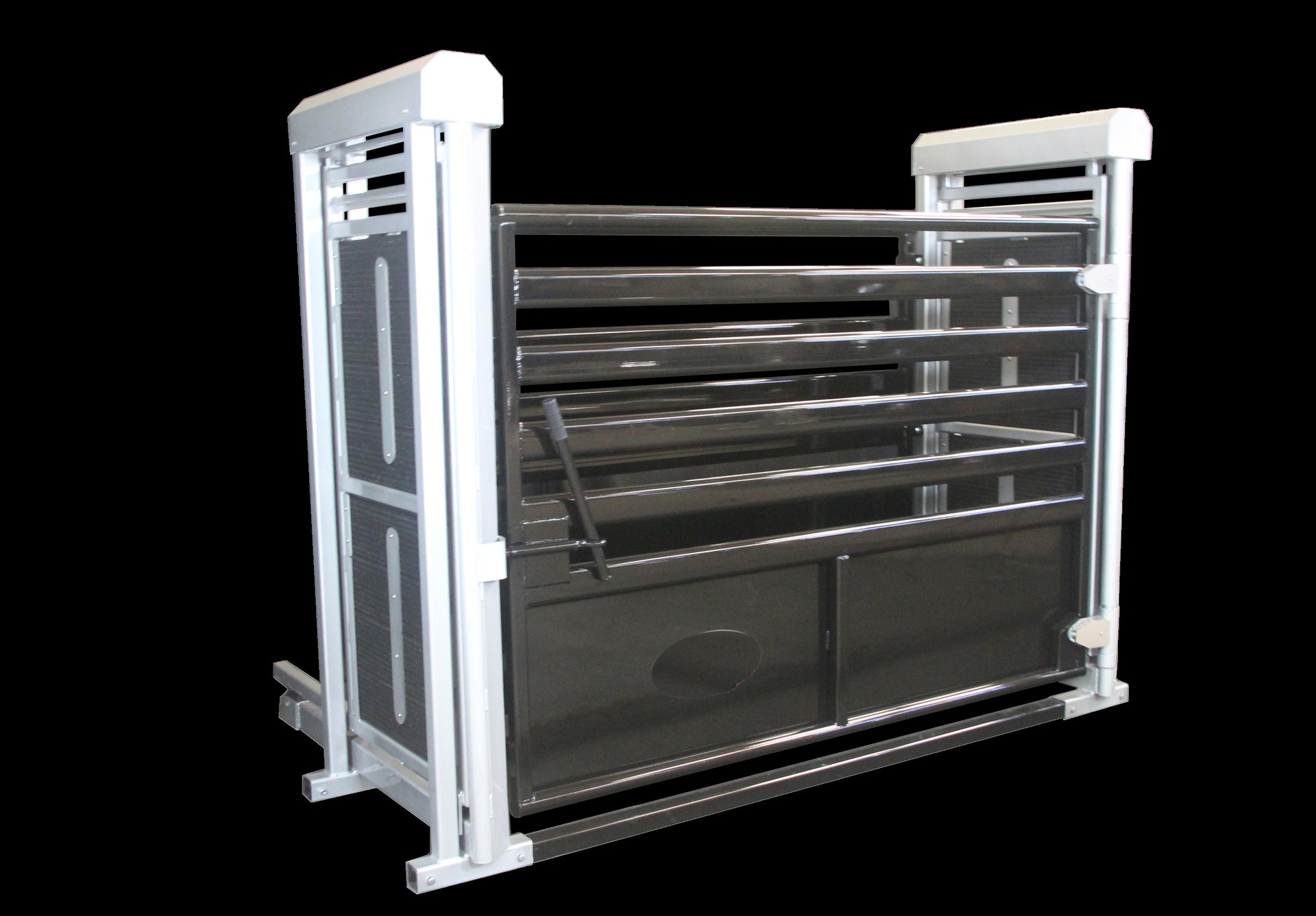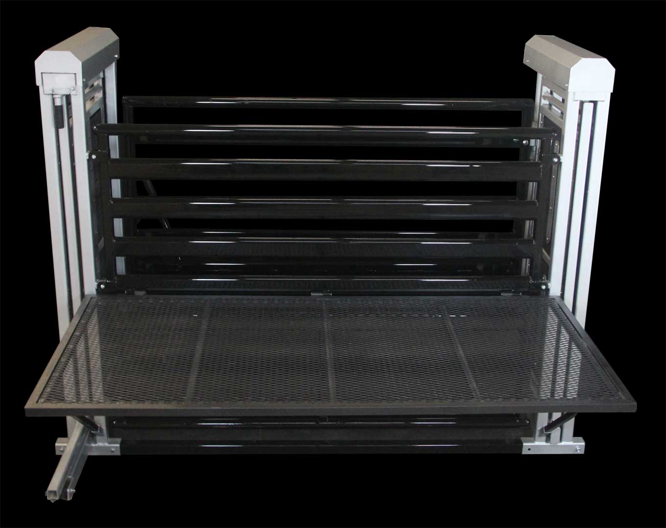 Red River Arenas has significantly improved the world of bucking chutes to a whole new level. This new bucking chute is designed with the cowboy, the animal, and the stock contractors in mind. Red River has used structural steel and schedule 40 pipe to construct the heaviest bucking chutes on the market today weighing 2,060 lbs. Each rolling center gate is filled with practically indestructible Rumber® to eliminate noise while the rough stock is in the chute and the rider is preparing for the ride. The center gates feature a unique "V-Groove Wheel" that is extremely strong, has ultimate high impact resistance, and is rust and compression resistant. It is placed on a 1-1/4" square structural tube (3/16 wall thickness), set on a diamond, resulting in a clean and smooth rolling gate. The bottom track of rolling door is uniquely designed by Red River so that it is nearly impossible for the opening and shutting of the gates to be obstructed by common dirt and debris. The roller guides at the bottom of each chute creates an easy open walkway from chute to chute (no head knocking extrusion). Each bucking chute door features a unique spring-loaded latch allowing the front gate to open under any condition with maximum functionality. Also unique to Red River Arena’s chutes is that the exit doors can open to the inside of the chute to provide pressure to training bulls or when bucking junior bulls. Every Red River bucking chute comes with a 4'x 8' standard attached platform that is sprayed with truck bed liner that provides an easy, non-slip access.
