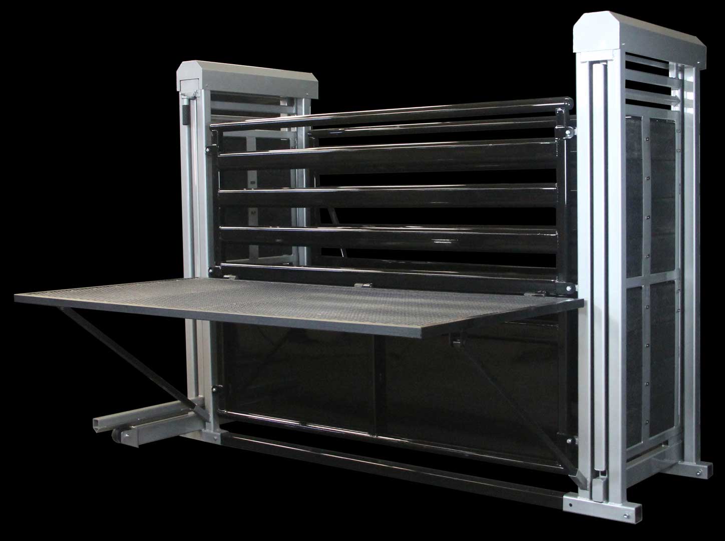 Red River Arenas' Bucking Chutes are available in a left or right delivery option. Add-On Bucking Chutes are also available for a left or right delivery. Each add-on bucking chute features a single, Rumber®-filled roll gate. The open end of the chute must be attached to the roll gate of a corresponding (left/right delivery) chute to create a series of connected chutes. Each Add-On Chute comes standard with an attached folding platform. Chutes consist of one Rumber®-filled slide gate, a side door, and a back door with attached platform. Bucking Chute Stripping Chutes are available.