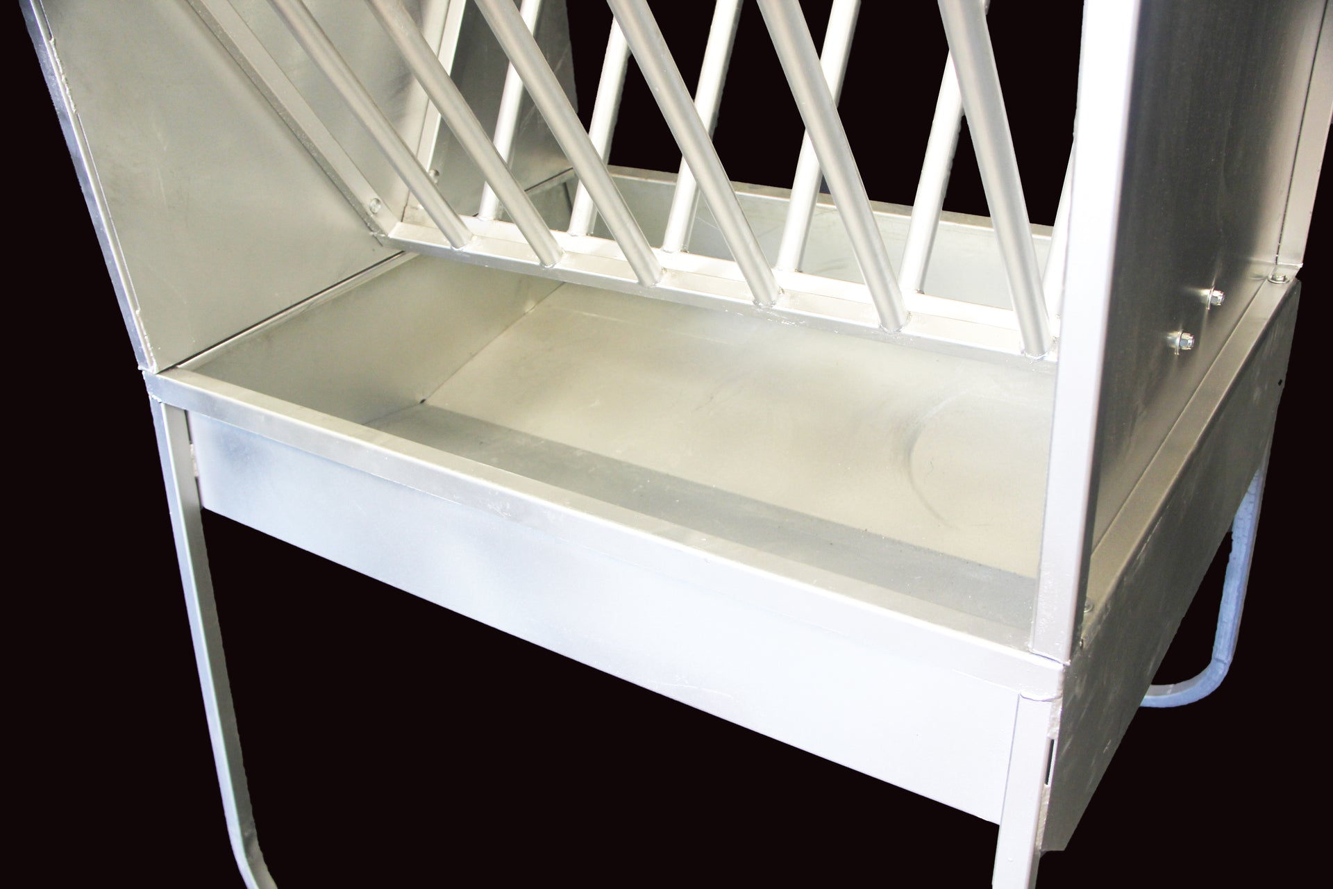 - Hay Rack constructed from 14 gauge galvanized round vertical braces and 16 ga galvanized sheet metal ends