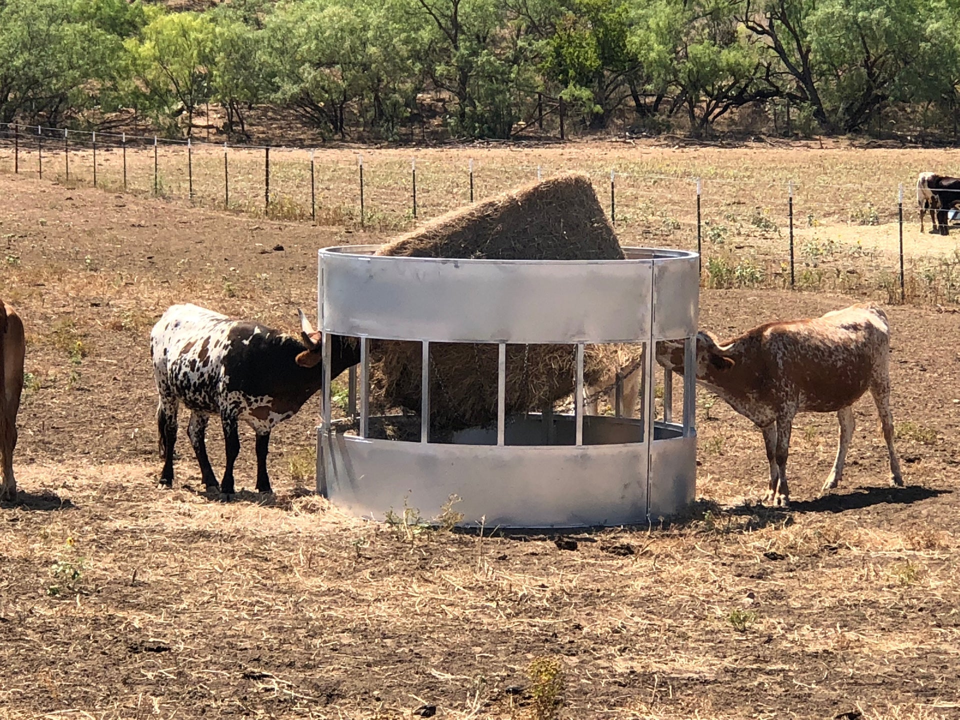 The pictures of these feeders were made in our owners feedlot. After the lease cattle are returned and are retired to become "cows", there would be approximately 50 head in a pasture on 3 of these feeders. He would feed a round bale every other day in these feeders and you can tell from the ground around the feeders, there wasn't any waste.